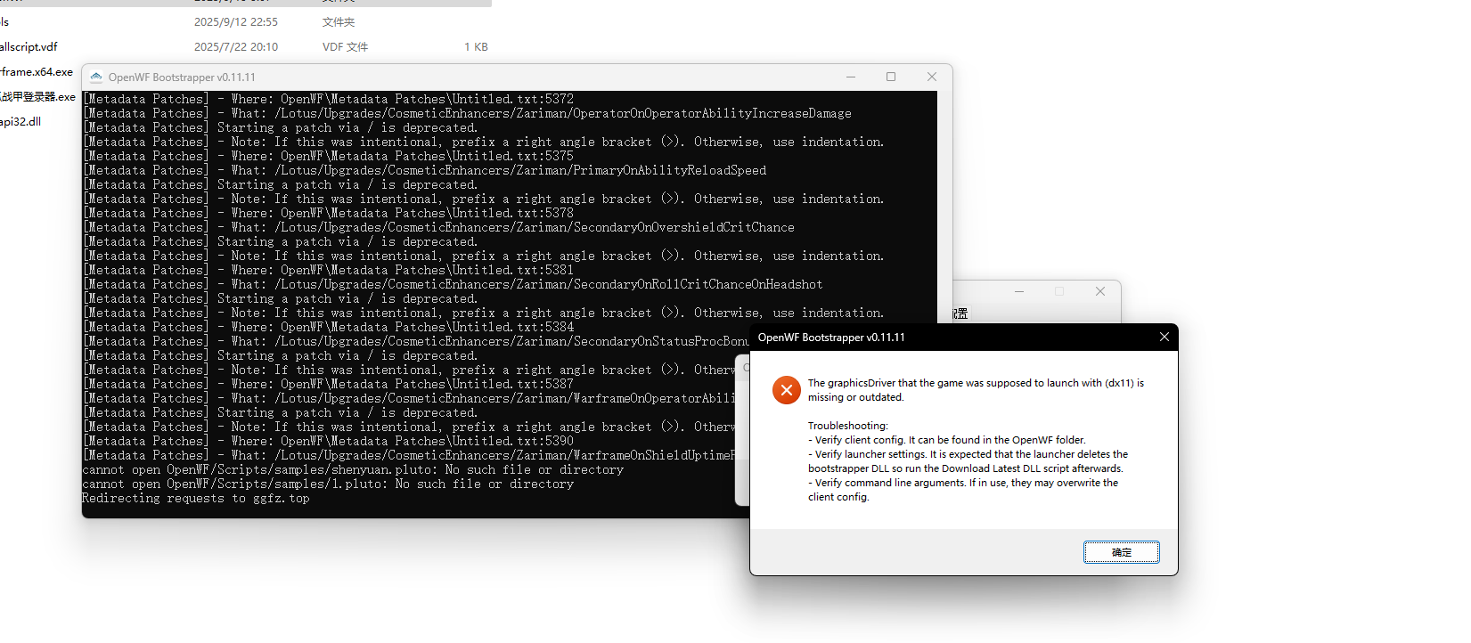 - Verify client config. It can be found in the OpenWF folder. - Verify launcher settings.It is expected that the launcher deletes the bootstrapper DLL so run the Download Latest DLL script afterwards. -Verify command line arguments. If in use, they may overwrite the client config.