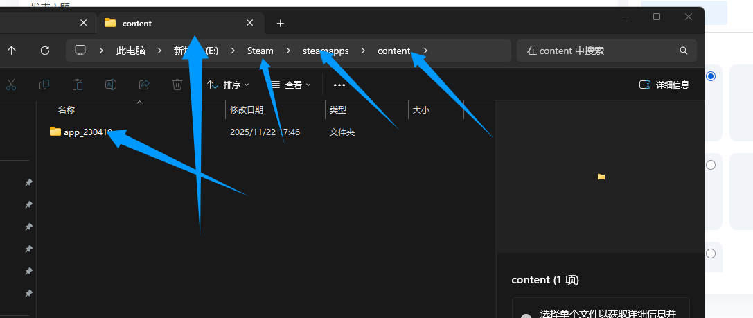 下载不会提示进度 位置在这里 你安装steam的地方 什么什么文件的这里 (这个和你的steam的星际战甲 不重合 你可以把下载的旧版复制也好剪切也好放在被的自己能看见的地方